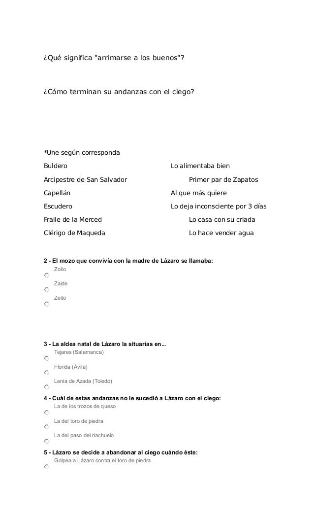 Preguntas De Examen Lazarillo De Tormes. Se llama lázaro de tormes, nació dentro del río tormes, una pequeña aldea de salamanca (españa). 37¿qué hacía la madre de lazarillo para ganarse la vida?