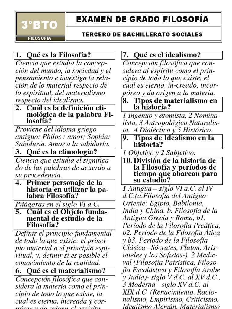 Preguntas De Examen De Filosofia 1O Bachillerato. Se consideró necesario que los educandos evaluaran en orden descendente las principales dificultades que afrontaron durante el estudio de la asignatura en cualquiera de los programas recibidos (tabla 4) examen filosofia 1 bachillerato examen filosofia 1 bachillerato. Juega y aprende con las 159 preguntas en 19 test de filosofía de 1º bachillerato.