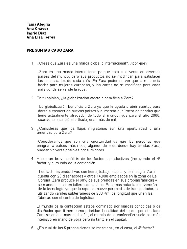 Preguntas y respuestas caso zara. 1-Cómo hace Zara para crear experiencias de marca memorables para sus clientes Zara a conseguida ofrecer lo que el consumidor les pide y además hacerlo en el menor tiempo posible a un precio asequible y con una buena calidad. Zara es una cadena de moda española de arteijo la coruña españa. Preguntas Y Respuestas Caso Zara.