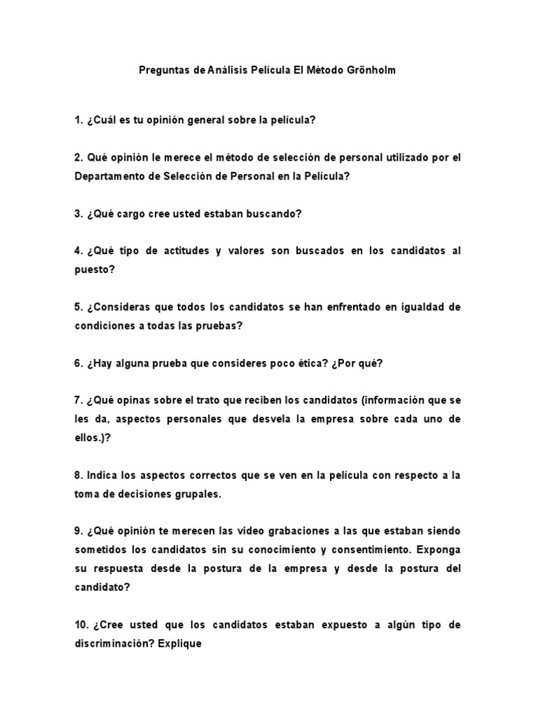 Preguntas y respuestas de la pelicula el metodo. 10-Narra cómo se da la relaciones entre el psicólogo y los candidatos al puesto Su relación fue entre inconforme a todo lo que se hacía en cuanto al método Gronholm supongamos para que. Alto Ejecutivo en un área que representa a la empresa teniendo interacción con otros pares con socios con proveedores. Preguntas y Respuestas de la pelicula el metodo.