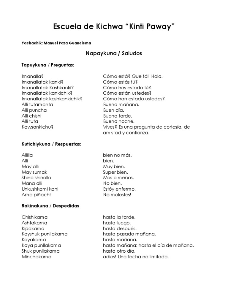 Les invito a que lo vea y siga perfeccionando aun mas su vocabulario. OTHER SETS BY THIS CREATOR. Dialecto Kichwa - Preguntas y Respuestas Frecuentes.